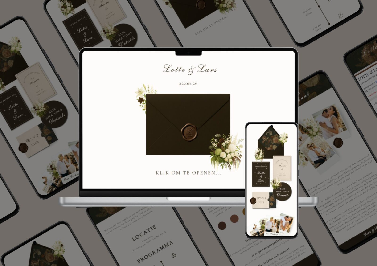 We ontwerpen niet alleen digitale uitnodigingen of websites, maar ook complete huisstijlen voor je bruiloft. Geïnteresseerd? Bekijk dan onze Trouwdesign bundel.