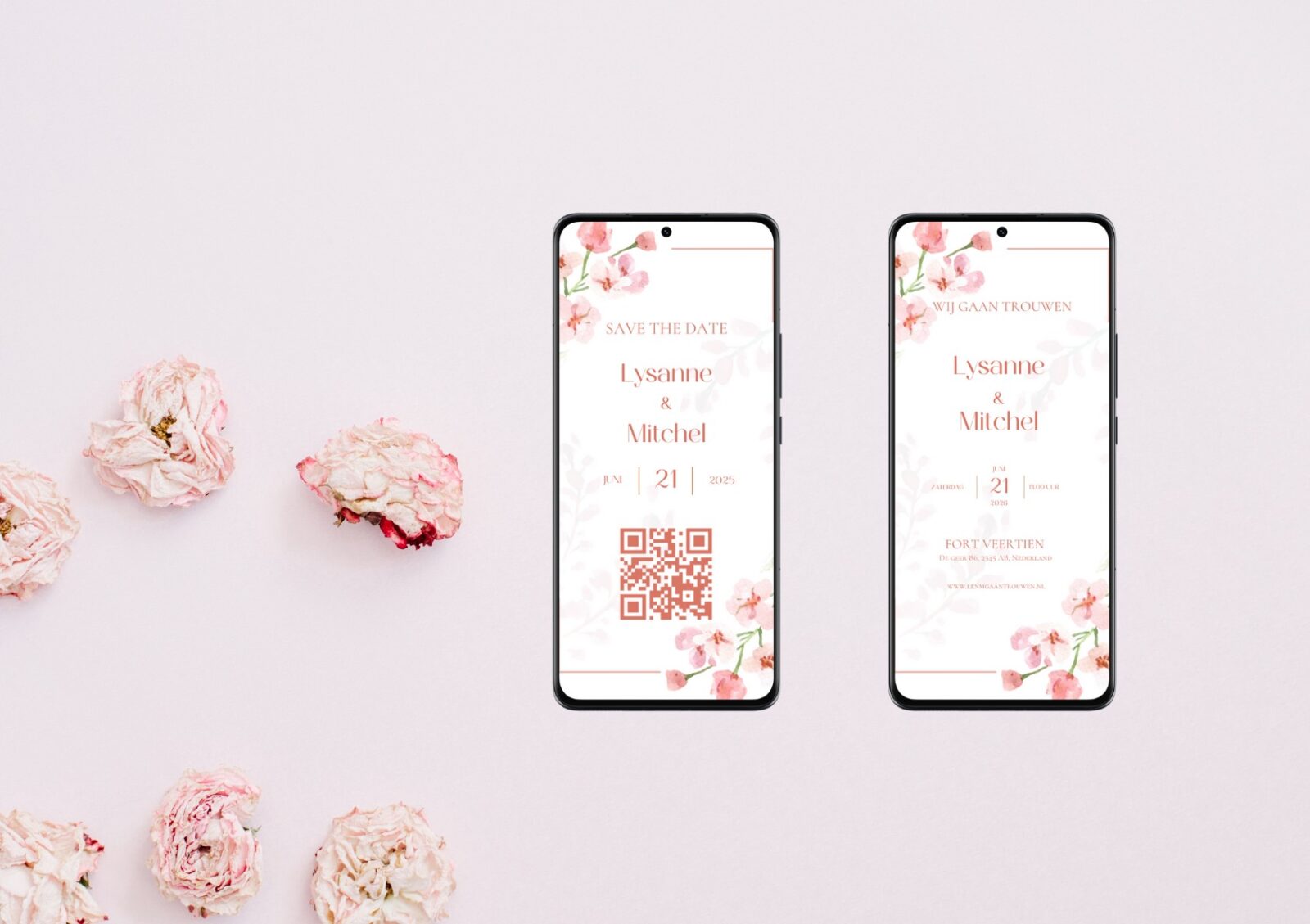 Lysanne & Mitchel kozen voor een budgetvriendelijke optie: een digitale save the date en uitnodiging die zij online konden versturen. Met de save the date konden gasten direct hun agenda blokkeren voor hun bruiloft en via de uitnodiging werd ook de trouwwebsite met hun gasten gedeeld.